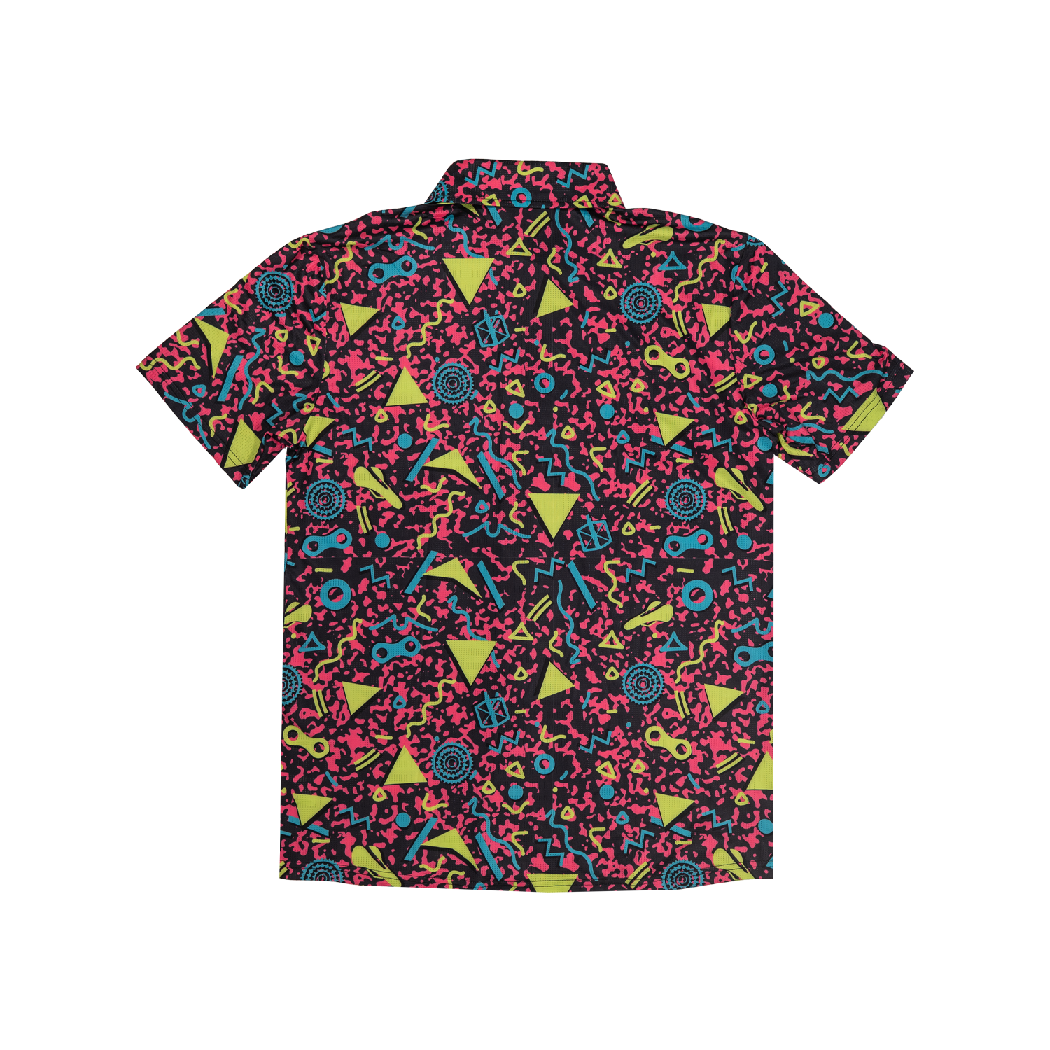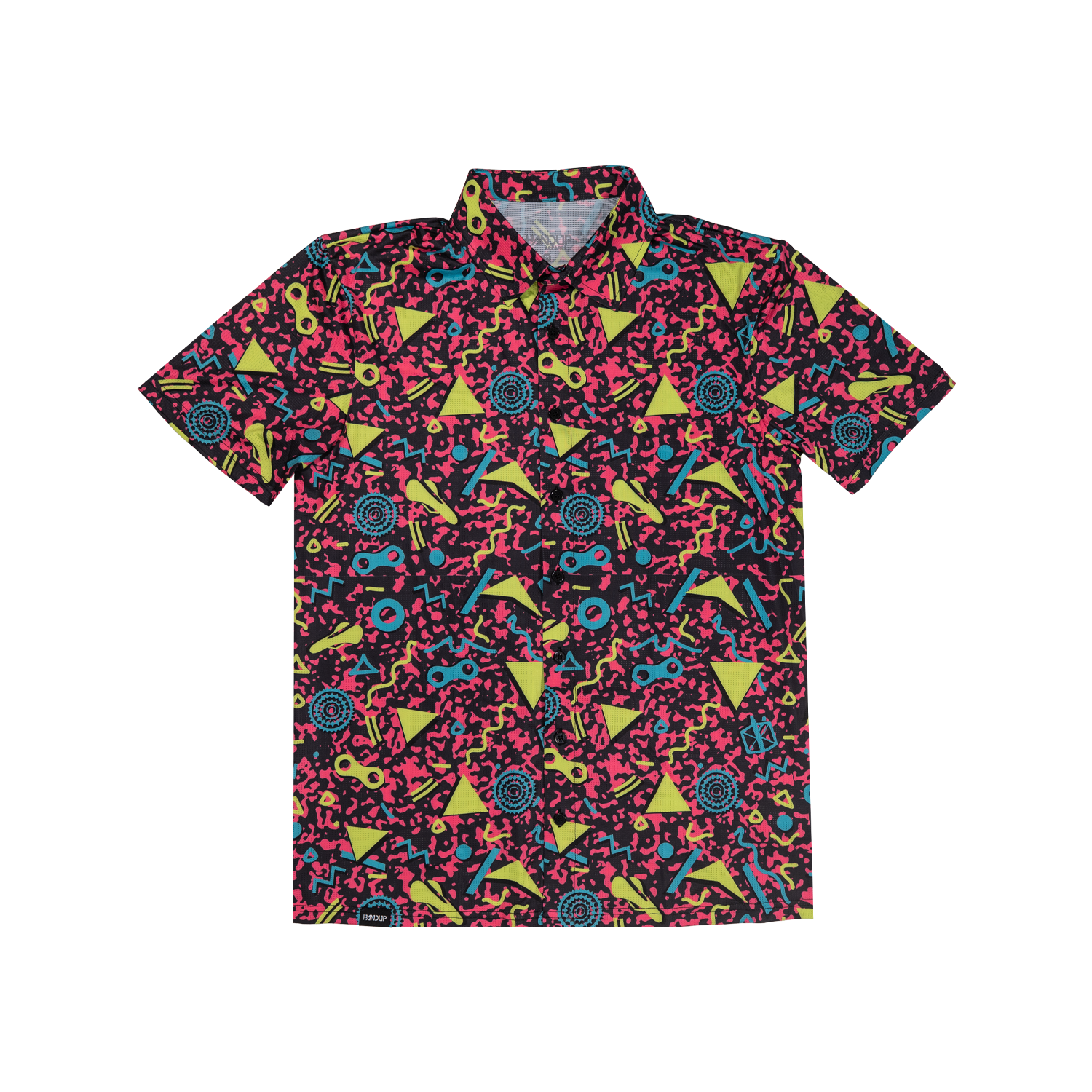 Straight from the roller rink to the trail, this button up is a full-send throwback to the bright, geometric chaos of ’90s roller rink carpets. Neon colors, wild shapes, and vibes you could feel through your socks, if you ever skated under blacklights while bad pop music blasted, this shirt is for you!