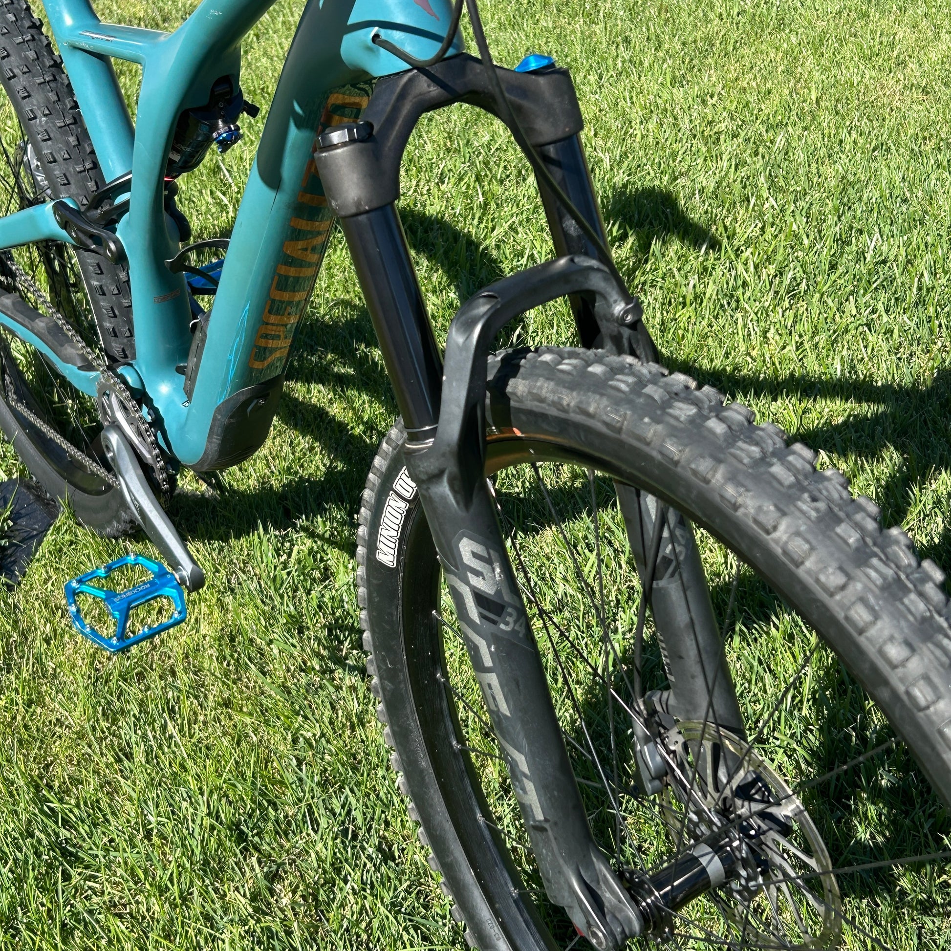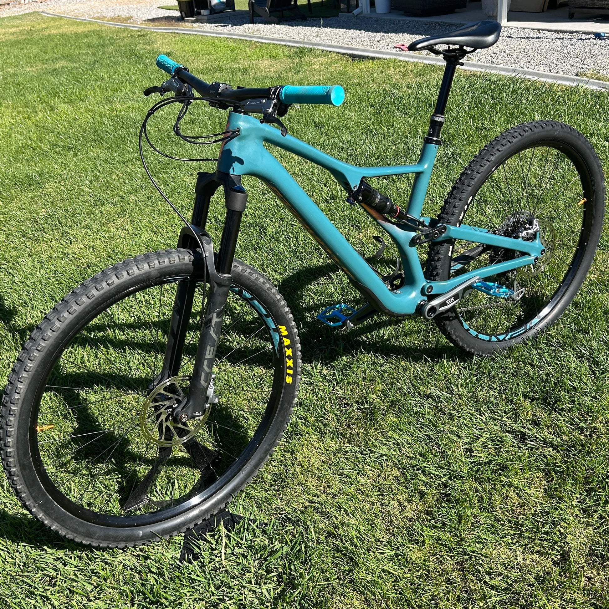 Bike is custom built with PNW Dropper Post, Specialized Bar, Uno Stem, Specialized Bridge Saddle, Light turquoise Pedals and Grips, Roval Traverse, Maxxis Tires, SWAT storage box with pump bag and tools bag, side water bottle cage, etc.